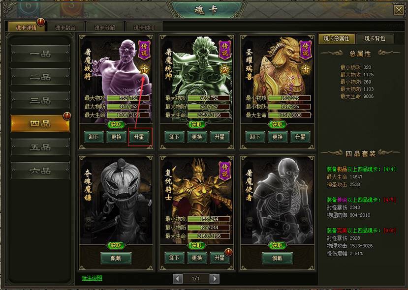 (3)可在魂卡详情界面中对当前穿戴的魂卡进行升星操作,升星需消耗魂值,最高可提升至5星,升星可提升魂卡自身属性的%加成