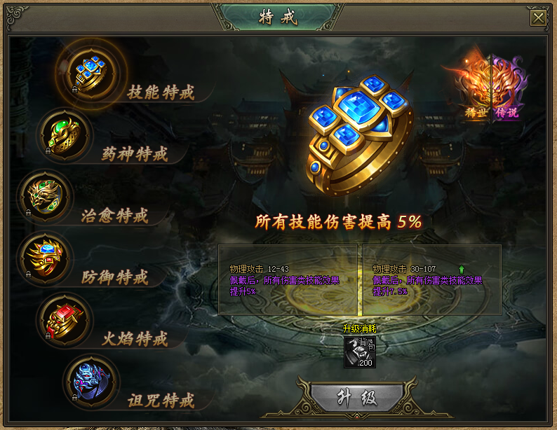 (3)稀世特戒包含技能、药神、治愈、防御、火焰、诅咒6大特戒,合成时消耗特戒碎片;传说特戒包含神圣、神力、复活、麻痹、嗜血、无敌6大特戒,合成时需消耗3个同类型的低级特戒