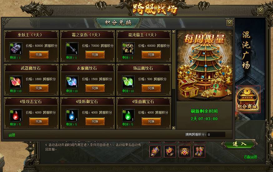 (1)跨服功能开启后,通过跨服战场界面中的“积分商城”按钮打开跨服积分商城